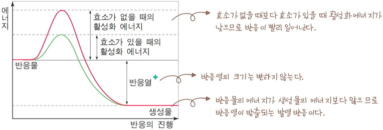 효소의 기능과 특성 (1) 물질대사와 효소① 생물체에서 일어나는 화학 반응을 물질대사라 하며, 효소가 관여한다.② 물질대사는 에너지의 출입이 함께 일어나므로 에너지 대사라고도 한다.③ 물질대사에는 물질을 합성하는 동화 작용과 물질을 분해하는 이화 작용이 있다. (2) 활성화 에너지와 효소① 어떤 물질이 화학 반응을 일으키기 위해 필요한 최소한의 에너지를 활성화 에너지라고 한다.② 활성화 에너지가 낮아지면 반응을 일으킬 수 있는 분자 수가 많아져 반응 속도가 증가한다.③ 효소는 반응물인 기질과 결합하여 활성화 에너지를 낮춤으로써 물질대사의 속도를 증가시키는 생체 촉매이다.  (3) 효소의 특성① 효소는 기질과 결합하는 활성 부위를 가지고 있다.② 효소와 기질이 결합되어 효소, 기질 복합체를 형성하면 화학 ..