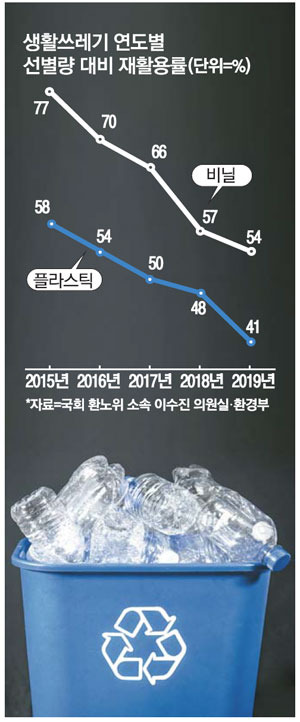 재활용 하기도 어려울 뿐 아니라 경제성도 많이 떨어지는 일회용 비닐봉투. 자원순환사회연대에 따르면, 가정에서 배출되는 플라스틱 쓰레기 중 비닐류 쓰레기가 차지하는 비중은 50% 이상이라고 한다. 그렇다고 버려지는 쓰레기들이 전부 재활용 되는 것은 아니다. 특히 가장 많은 비중을 차지하는 비닐과 플라스틱의 재활용률은 뚜렷한 하향세를 보였다. 최근 코로나19 사태 영향으로 늘어난 생활 폐기물은 이같은 상황을 더욱 심화시켰는데 길가 주변이 쓰레기기로 가득차 통행에 지장이 있을 정도이다.