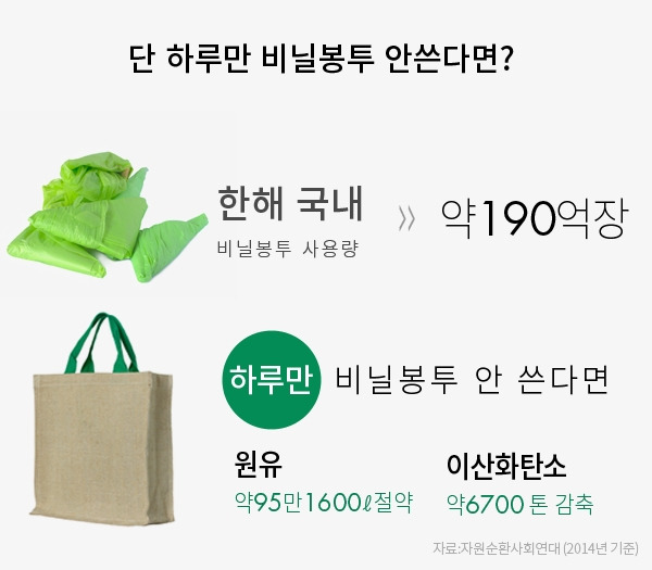 만약 우리가 단 하루만 비닐봉투를 사용하지 않는다면 어떻게 될까. 자원순환사회연대에 따르면 약 5200만 장의 비닐봉투를 제작하는데 필요한 원유 약 95만1600L를 절약할 수 있으며, 이와 동시에 이산화탄소 약 6700톤이 감축된다고 한다. 이외에 환경부는 비닐봉지 사용 금지 조치로 연간 21억 2800만 장의 비닐 사용량이 감소될 것으로 예상하였다.