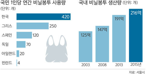 서울시가 밝힌 자료에 따르면 2015년 기준 국민 1인당 비닐봉투 사용량은 420개로 압도적인 1위를 기록하고 있었다. 연간 사용되는 전체 비닐봉지 숫자는 약 218억 개를 넘어선다. 이는 유럽연합 주요국의 평균(연간 198장)보다 두 배 이상 높은 세계 최고 수준이다. 또한 국내 비닐봉투 생산량은 해를 거듭할수록 증가하고 있다. 이 작은 나라가 이렇게나 많은 비닐봉투를 생산하고 사용한다는 것이 놀랍다. 동시에 이러한 사실을 사람들이 모르고 있다는 것 또한 안타깝다.