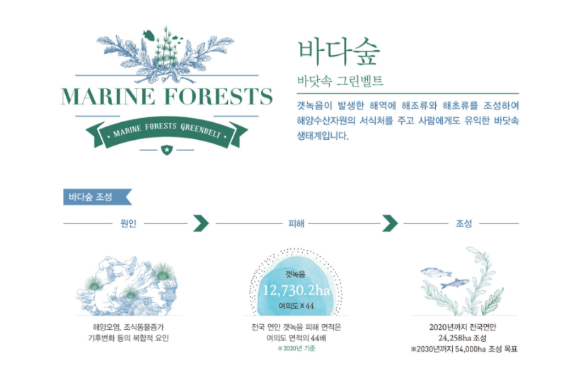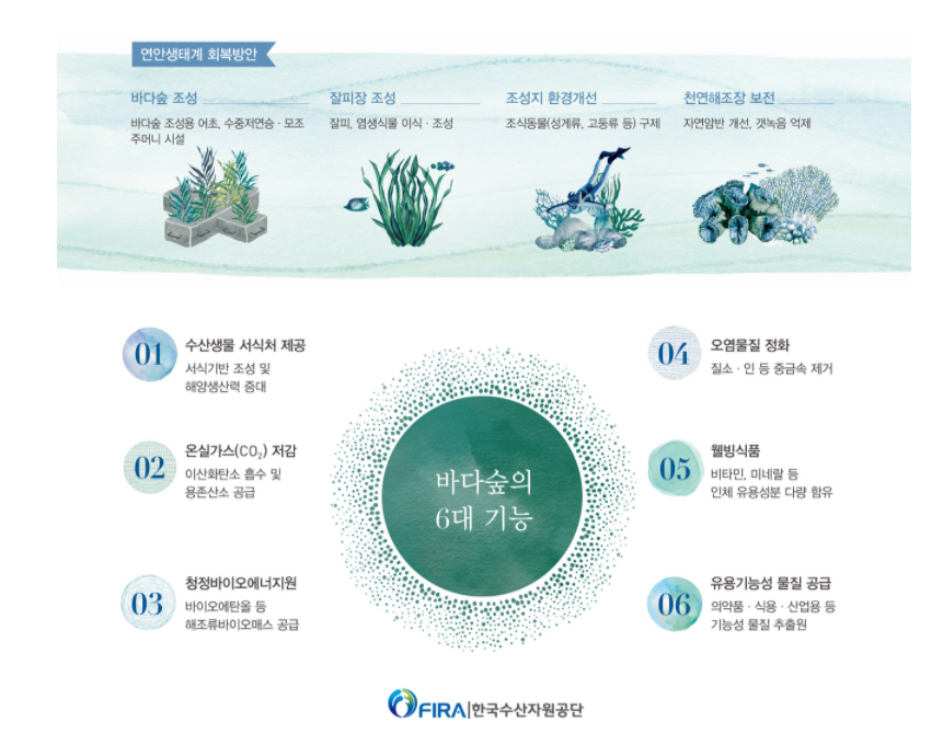 어장 생태환경 개선사업으로는 '바다숲' 프로젝트가 진행중입니다. 갯녹음이 발생한 해역에 해조류와 해초류를 조성하여 해양수산자원의 서식처를 주고 사람에게도 유익한 바닷속 생태계를 조성하는 것입니다. 바다숲의 6대 기능으로는 위의 자료와 같이 수산생물 서식처 제공, 온실가스(이산화탄소) 저감, 오염물질 정화 등 바다 생태 환경의 회복을 목적으로 하고 있습니다.